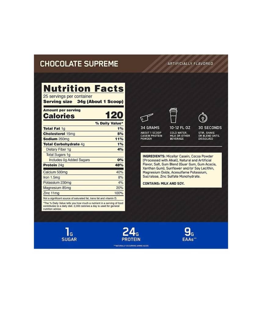 پودر پروتئین کازئین میسلار ۱۰۰٪ Gold Standard اپتیموم نوتریشن – طعم شکلات سوپریم، ۸۵۰ گرم (۲۵ سروینگ)